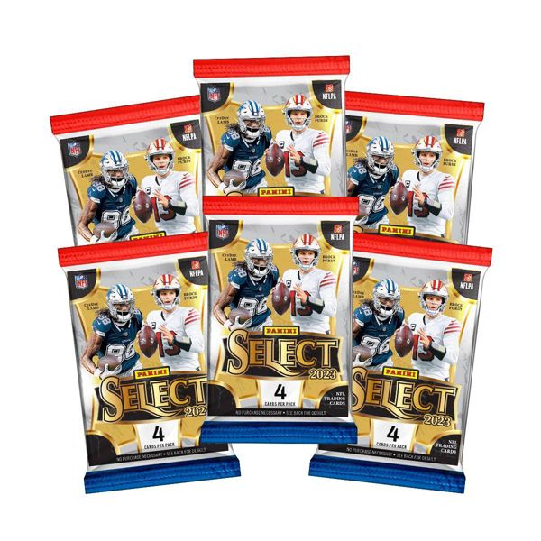 Panini presents the 2023 NFL Select Football Trading Card Blaster Box. Each box contains 6 packs with 4 cards per pack. Find 3 Blaster Exclusive Green and Yellow Prizm Die-Cuts! Find 1 Silver Prizm Die-Cut per box on average. Look for Autographs from some of the Game's Hottest Stars!