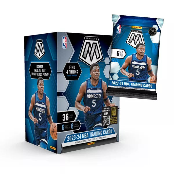Panini presents the 2023-24 NBA Mosaic Basketball Trading Card Blaster Box. This box contains 6 packs with 6 cards per pack. Find 4 Prizms Per Box on Average. Look for the Ultra-Rare Mosaic Genesis Prizms! Look for the Ultra-Rare Inserts including Stained Glass and the New Micro Mosaic!