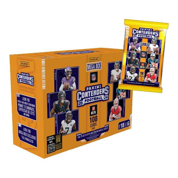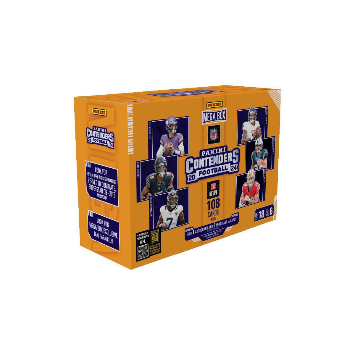 Panini presents the 2024 NFL Contenders Football Trading Card Mega Box. Each box contains 6 packs with 18 cards per pack. Look for an Autograph and Memorabilia Cards! Look for Ultra-Rare Inserts including Permit to Dominate, Superstar Die-Cuts and More! Look for Mega Box Exclusive Teal Parallels! Collect them all! Content may vary.