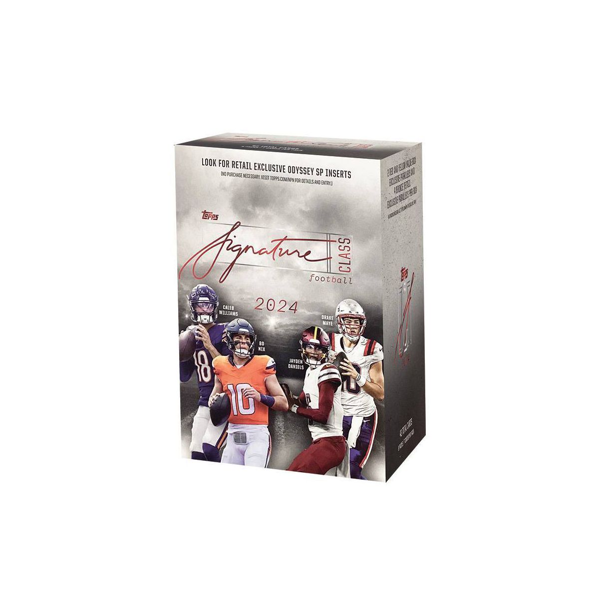 Topps presents the 2024 Signature Class Football Trading Card Value Box. Each box contains 6 packs with 7 cards per pack. Look for Retail Exclusive Odyssey SP Inserts. Look for Red and Yellow Value Box Exclusive Parallels and Bronze Retail Exclusive Parallels. Content may vary. Cards imaged are not guaranteed.