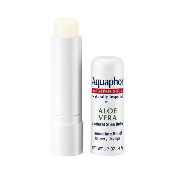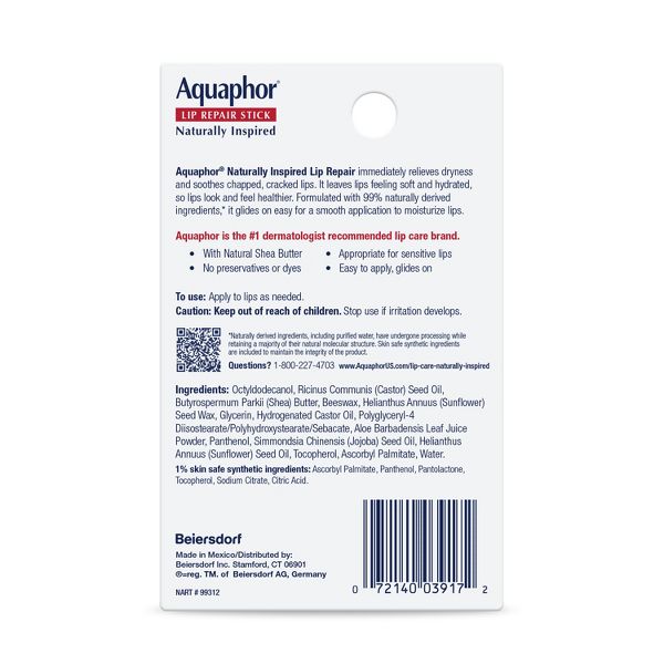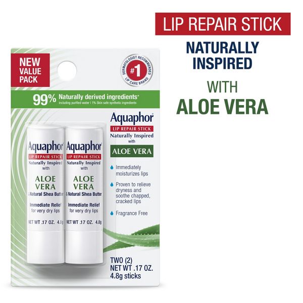 Find long-lasting moisture from the #1 dermatologist recommended lip care brand with Aquaphor Naturally Inspired Lip Repair Stick with Aloe Vera. Aquaphor Naturally Inspired Lip Repair Stick immediately relieves dryness and soothes chapped lips. This moisturizing lip balm stick leaves lips feeling soft and hydrated, so lips look and feel healthier. Formulated with 99% naturally derived ingredients*, this lip balm stick contains nourishing vitamins and Natural Shea Butter. It glides on easily and is great for use in dry, cold or windy conditions. Apply this Aquaphor lip balm stick liberally to dry or chapped lips as often as needed. *Naturally derived ingredients including purified water, have undergone processing while maintaining a majority of their molecular structure. Skin safe synthetics are included to maintain the integrity of the product.