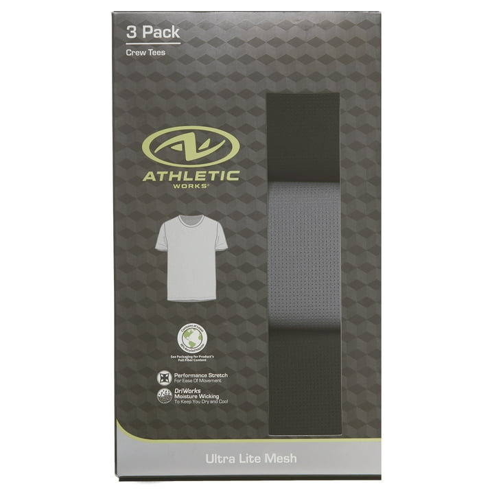Experience all-day breathability and performance with our 3-pack of Ultra Lite Mesh Crew Undershirts. These versatile tees are crafted from a lightweight recyclable synthetic blend, offering plenty of stretch to move with you during any activity. Featuring quick-dry moisture-wicking technology, these shirts keep you cool, dry, and confident throughout your day. The athletic fit and short sleeve crew design make them perfect for layering or wearing on their own. Discover ultimate comfort with Athletic Works Men's Ultra Lite Mesh Crew T-Shirts! Only at Walmart.