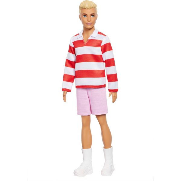 Ken doll wears a red and white striped, long-sleeve polo shirt paired with pink shorts for a colorful ensemble!