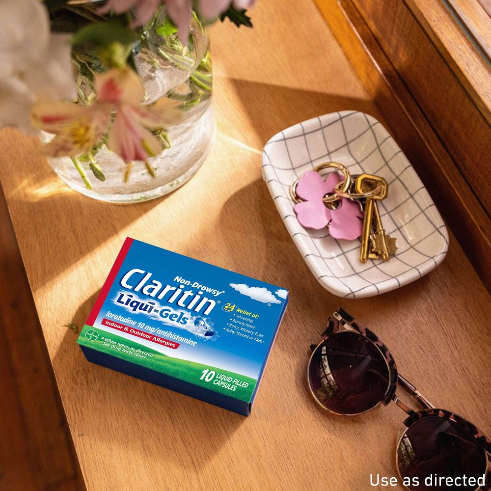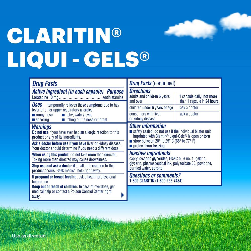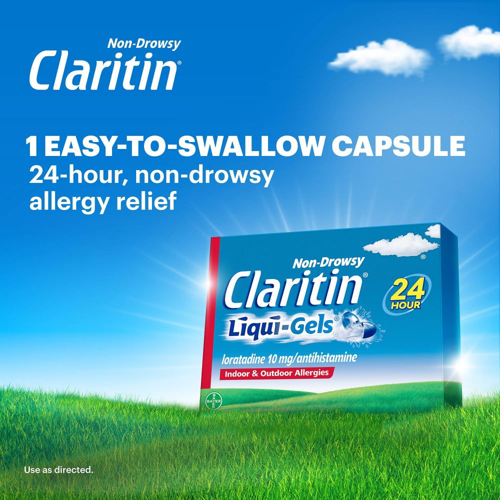 Claritin Liqui-Gels capsules provide powerful, 24-hour, non-drowsy relief of your worst indoor and outdoor allergy symptoms, including sneezing, runny nose, itchy/watery eyes and itchy throat/nose. Claritin provides relief of symptoms that can be triggered by over 200 different allergens. Claritin is an antihistamine, so it hinders the cascade triggered by allergens. For adults and children ages 6+. One capsule contains 10 mg of loratadine.