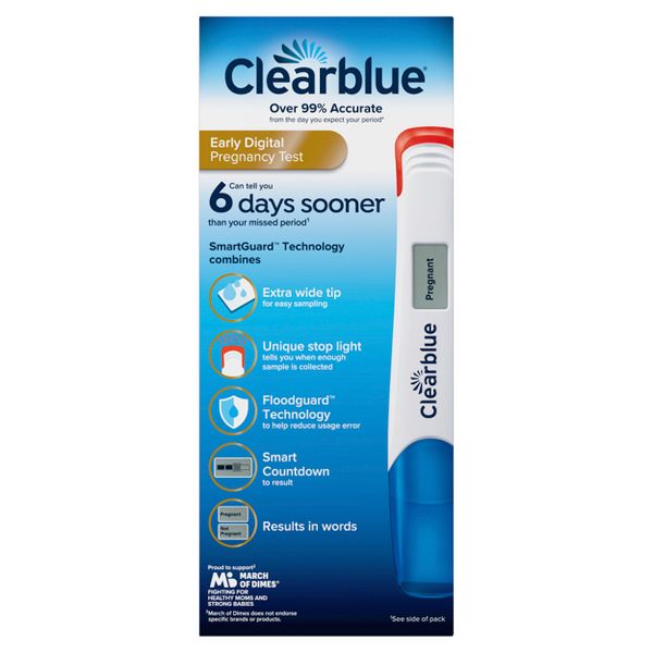 The Clearblue Early Digital Pregnancy Test is our most sensitive digital home pregnancy test[4], delivering results up to 6 days before you miss your period[2]. Once the test is running, the Smart Countdown will appear on screen to reassure you the test is progressing, counting down to your clear digital result in words, within just 1-5 minutes. Each pack includes 3 individually wrapped digital pregnancy tests that detect the "pregnancy hormone" (hCG), which starts showing up in your urine shortly after implantation. This early pregnancy test is easy to grip and has an extra-wide tip for easy urine sampling. Plus, it features a digital display that gives clear results ("Pregnant" or "Not Pregnant"). Over 99% accurate[1], you can feel confident in your results.