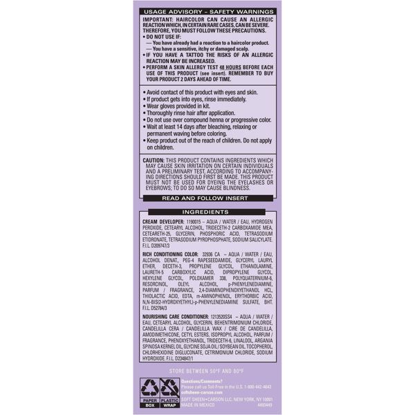 Fade-Resistant Rich Conditioning Color is an innovative formula that delivers vibrant, fade-resistant color and shine. This formula contains Dark and Lovely's exclusive Moisture Seal technology for double the conditioning power especially designed to help protect relaxed and natural hair while coloring. The result is silky, shiny hair and luxurious, rich color. Color so rich, so ultra-conditioning it lasts for up to 8 weeks Helps protect relaxed and natural hair while coloring Permanent non-drip hair color with 100 percent gray coverage With extra nourishing conditioner infused with 3 fruit oils - shea, avocado and olive - to provide intense nourishment