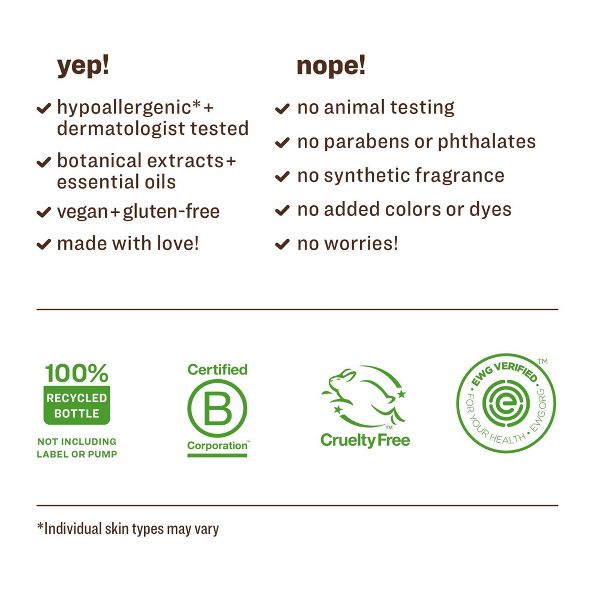 Vegan and gluten-free! Hypoallergenic and dermatologist tested. No synthetic fragrances, parabens, or phthalates. Cruelty-free and B Corp Certified. Our signature amber bottles are made from 100% Post Consumer Recycled (PCR) plastic and block out UV rays to protect the ingredients inside, while our pump is crafted with 50% PCR plastic.