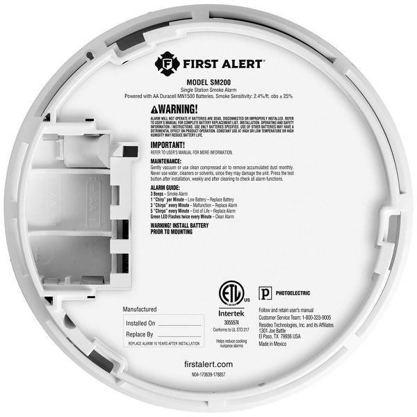 The SM200 battery-operated smoke alarm meets industry standards. Features First Alert's advanced sensing technology in an easy to install, slim profile alarm. Precision Detection provides advanced early warning while reducing the number of nuisance cooking alerts.