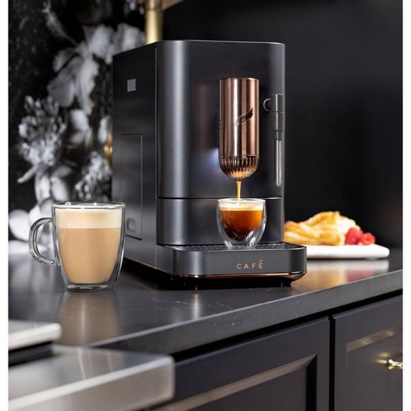 Café Affetto Automatic Espresso Machine + Frother Matte Black Make delicious Espresso, Americano, or dispense hot water with the Café Affetto Automatic Espresso Machine + Milk Frother. With a single press of a button and in less than 90 seconds, this automatic espresso machine dispenses your desired brew. Customize drink preferences by volume and strength, with a smart espresso machine that syncs with the SmartHQ app.