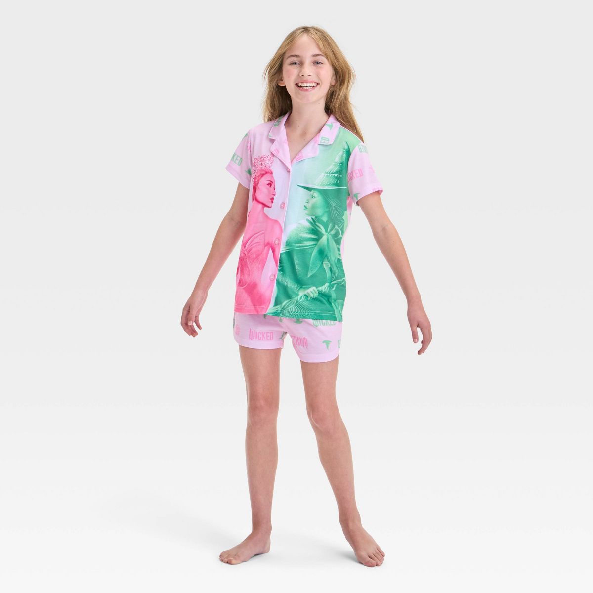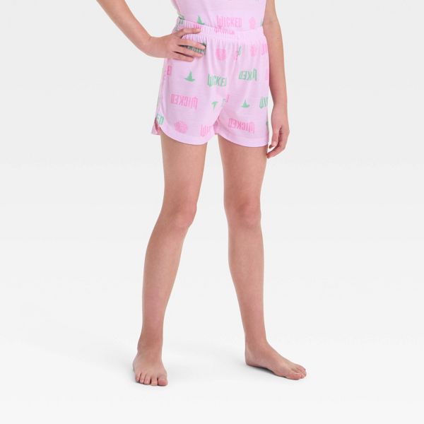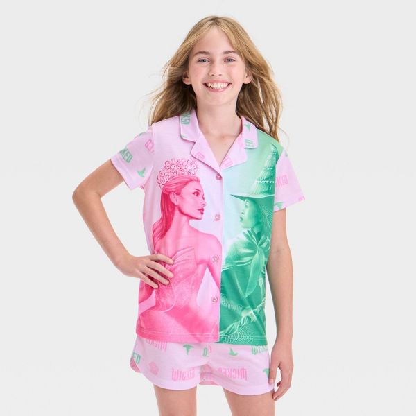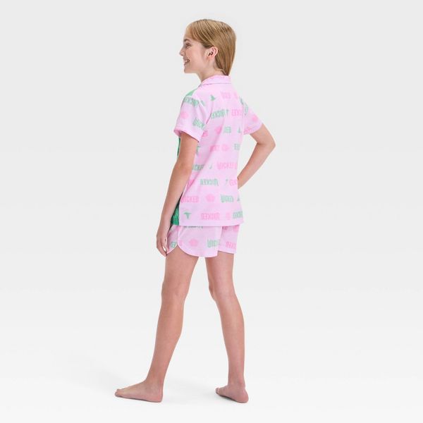 Add a magical touch to your kid's wardrobe with this Wicked Pajama Set. This set includes a sleep shirt and pajama shorts crafted from polyester, both featuring allover "Wicked" text. The short-sleeve sleep shirt has a notched collar with a front button-down style and showcases a graphic of witches Glinda and Elphaba. Plus, the set also includes pull-on pajama shorts featuring an elastic waistband for a snug, secure fit..