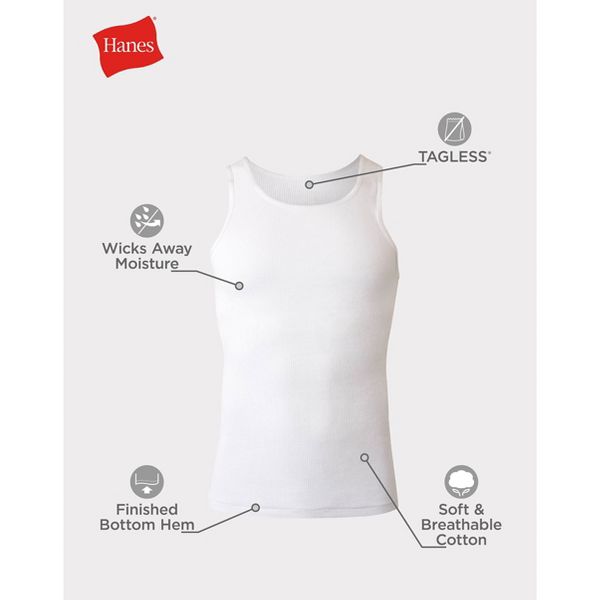 Not all tank undershirts are the same. The experts at Hanes® spend their days making basic ribbed tank undershirts even better. These ComfortSoft® cotton tanks (heathers are a cotton blend) now feature a longer length and all-day flex fabric that moves with you and maintains the fit you expect. Cool Comfort® moisture-wicking fabric works to keep you feeling cool and comfy - no matter what the day brings. Soft and lightweight, these cotton tanks are designed with a banded scoop neckline and armholes for exceptional sturdiness. One more detail you'll appreciate is the Tagless® design for itch-free comfort. Stock up on these Hanes-best cotton tank undershirts for men in a convenient multipack.