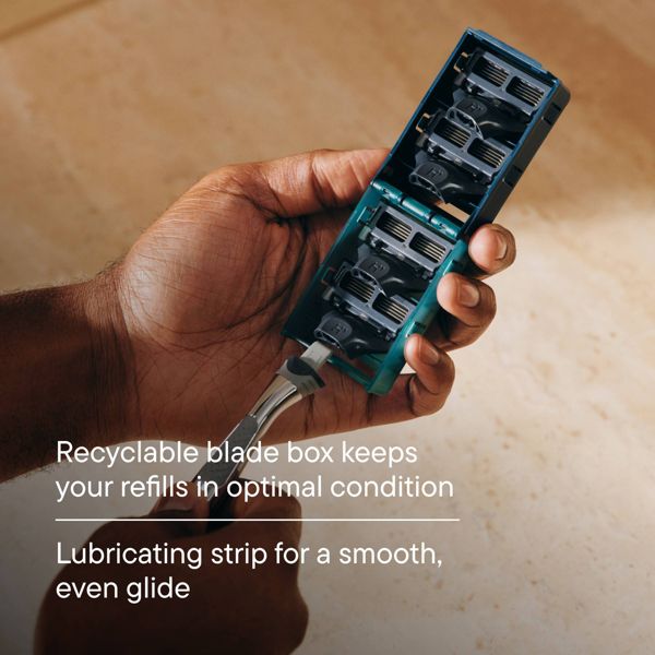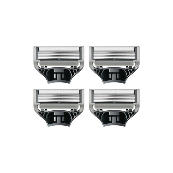 Blade cartridges with five sharp German-engineered blades, flex hinge, and lubricating strip