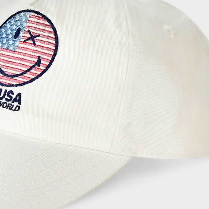 Get ready for some fun in the sun with the Kids' SmileyWorld 4th of July Baseball Hat in off-white.This hat features a cheerful smiley face print, adding a playful touch to any outfit. Crafted from cotton, it offers breathable comfort for all-day wear. The adjustable back snap ensures a perfect fit, making it easy to customize for your child's comfort. Perfect for celebrating the 4th of July or any sunny day, this hat is both stylish and practical.