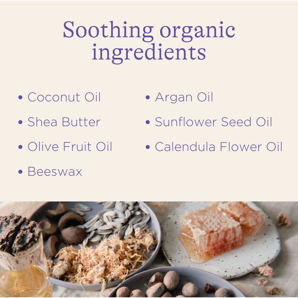 JUST 7 ORGANIC INGREDIENTS -Certified organic sunflower oil, olive oil, beeswax, coconut oil, shea butter, calendula flower extract, and argan oil