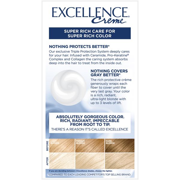 Extra Light Ash Blonde Hair Color for Gray Hair Coverage: L'Oreal Paris Excellence Creme Extra Light Ash Blonde Permanent Hair Dye offers 100% gray coverage for all hair types, even on the most stubborn grays. Exclusive non-drip creme formula for gorgeous hair color from root to tip