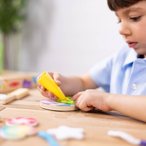 Give playtime some pop by giving kids three and older everything they need to create sweet play treats again and again! Decorate four unique wooden lollipops with felt pieces and fabric cords that attach to self-stick tabs on the pops. Package the pops in see-through sleeves and use the wooden storage tray for presenting options to hungry customers, who can pay for their food with the play money. A reusable activity card lets young confectioners price their offerings and shows them how to use the decorating tool to swirl designs on their deliciously imaginative lollipops. The reusable lollipop play set promotes hand-eye coordination, sorting and counting skills, and imaginative play. This product is certified by the Forest Stewardship Council. FSC certification ensures that products come from responsibly managed forests that provide environmental, social, and economic benefits, and that forests are protected for future generations. Please note that FSC certification applies to new inventory only (FSC C156584)