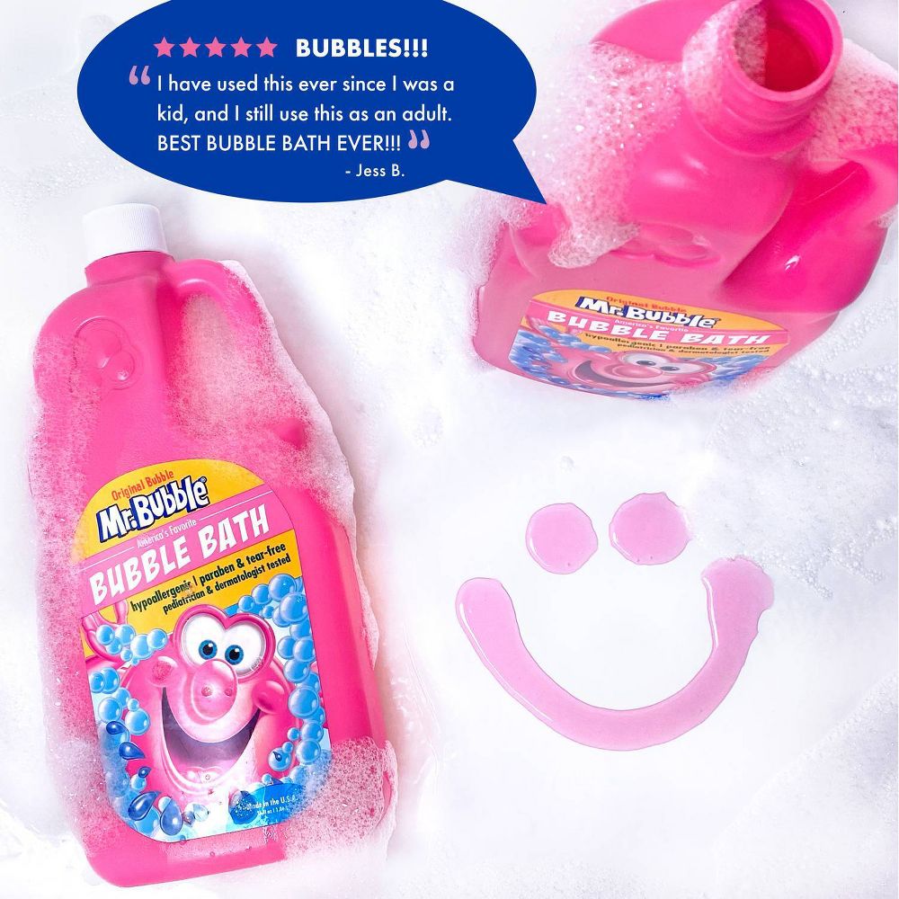 Mr. Bubble is America’s favorite bath-time buddy! He’s been moms’ trusted partner for more than 50 years, turning bath time into quality time that both mom and kids to enjoy. He’s the perfect bath-time pal for kids of all ages, making sure getting clean is even more fun than getting dirty! Directions: To create a tubful of bubbles, pour approximately 2 ounces into warm, running water.