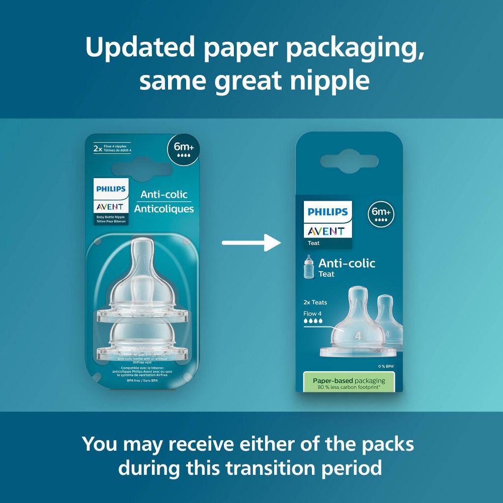 The Philips Avent Anti-colic nipple Flow 4 is great for babies 6 months and older and breastfed babies learning to drink from a bottle. The anti-colic valve integrated into the nipple is designed to keep air away from your baby's tummy to reduce colic and discomfort. As your baby feeds, the valve flexes to allow air into the bottle to prevent vacuum buildup and vents it towards the back of the bottle. The nipple shape allows for a secure latch, and the ribbed design helps prevent collapse for uninterrupted, comfortable feeding. The anti-colic nipple is made of flavorless, odorless, soft, BPA-free silicone that resists discoloring and stickiness. Philips Avent bottle nipples are available in different flow rates to keep up with your baby’s growth. We recommend replacing nipples every 3 months for hygiene reasons. Use Philips Avent Anti-colic bottles only with Philips Avent Anti-colic nipples.