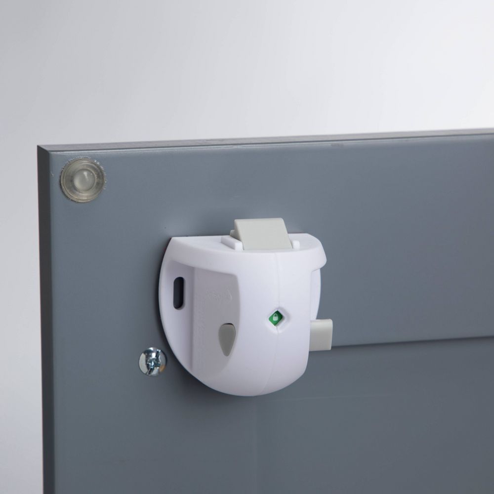 These ingenious locks install discreetly inside of your cabinets and drawers, making them invisible from the outside. It unlocks with a magnetic key that can be stored high up and out of your child's reach. A push of a button lets you disengage the lock during periods of non-use. When you're ready to keep things shut, the SecureTech locking indicator lets you know that the lock is properly engaged again. This standard set includes two locks and one key.