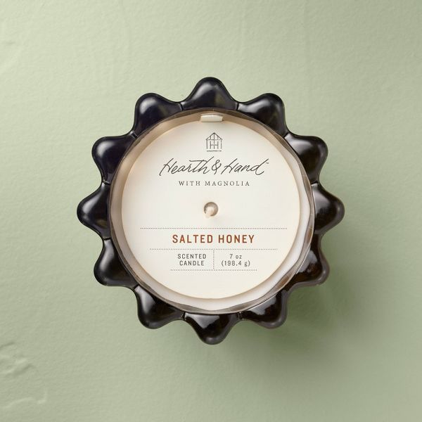 Create a warm and inviting atmosphere for any occasion with the Seasonal Ribbed Glass Jar Candle from Hearth & Hand™ with Magnolia. This scented jar candle features a round glass jar with a ribbed design for a decorative appeal. Made of glass, this round jar candle helps to create a delightful ambiance. Filled with soy and paraffin wax, this glass jar candle burns for around 28 hours.