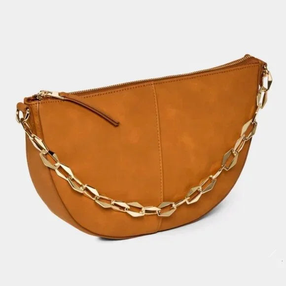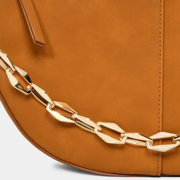 Description: Bring a stylish update to your accessories collection with this Slouched Half-Moon Shoulder Bag from Universal Thread. This unstructured shoulder bag features a single zipper compartment to carry your phone, wallet, makeup essentials and other items. Plus, it has an interior zip pocket for any additional space you need. Designed in a half-moon shape and featuring a faux-suede finish in a solid hue, this shoulder bag includes a metallic link chain strap in a gold tone to elevate your everyday style. Universal Thread: Found exclusively at Target.