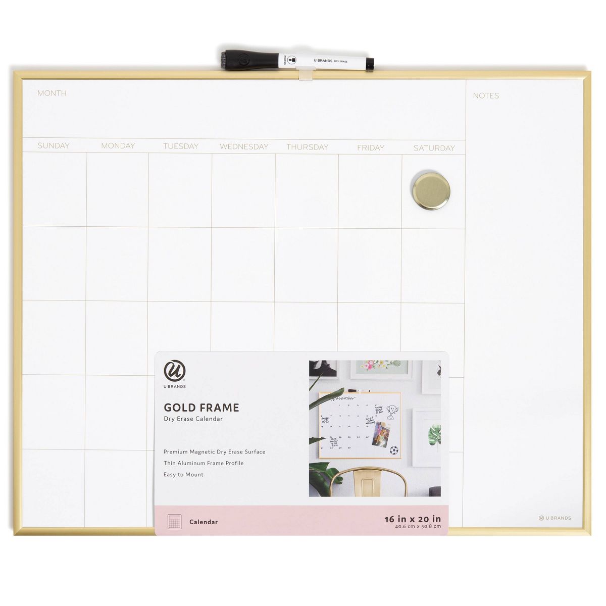 The modern U Brands® 16" x 20" Metal Framed Magnetic Dry Erase Monthly Calendar Board is a stylish and functional solution for keeping organized. Just use the accompanying marker to fill in the month's activities, then wipe clean and start all over again! The metal magnet makes it easy to add and remove photos and reminders as needed. The whiteboard's premium writing surface requires minimal ongoing cleaning care to ensure the best performance and resist ink staining and ghosting. The contemporary minimal design works with any decor. Whether at home, work, or school, this calendar board provides the perfect organization tool to stay on top a busy life.