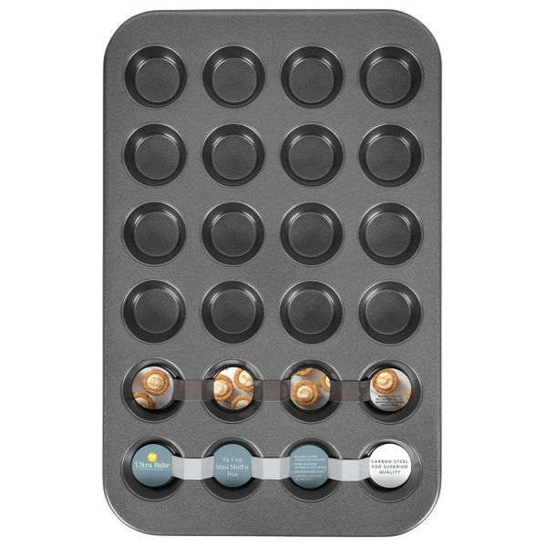 Bake mini cupcakes or muffins for your celebration with this Wilton Ultra Bake Professional Non-Stick Mini Muffin Pan. Great for baking small chocolate and vanilla cupcakes, mini blueberry muffins or small bite-sized appetizers, this 24-cavity mini muffin pan is great to have on hand for easy, convenient baking. The durable construction of this pan is designed to spread heat throughout the pan, ensuring your mini treats bake evenly. The non-stick coating is scratch-resistant and baked goods release without effort, so cleanup is quick and easy. Great for everyday use, this mini muffin pan is a must-have for bakers and decorators of all skill levels.