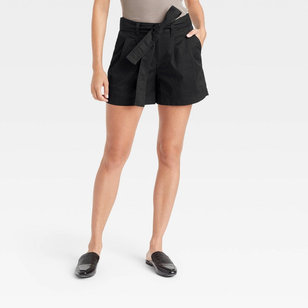 Description: The High-Rise Pleat-Front Shorts from A New Day™ will be a chic and stylish staple in your wardrobe that you'll turn to time and again. These solid-hued shorts are made from a breathable fabric blend with a touch of spandex for all-day comfort and stretch. They're designed with a pleated front, a high-rise waistband with a removable belt and a fly zipper with button closure, and topped with a matching fabric on-trend sash tie to perfect your style with a secure fit. Tailored to an above-knee length, these casual-fit shorts are ideal for the warmer months, and sport functional front pockets to let you stash your essentials when you're out and about. Tuck in a spaghetti top or a crewneck tee, and finish off your look with sneakers or sandals. Size: 2. Color: Black. Gender: female. Age Group: adult. Material: Cotton.