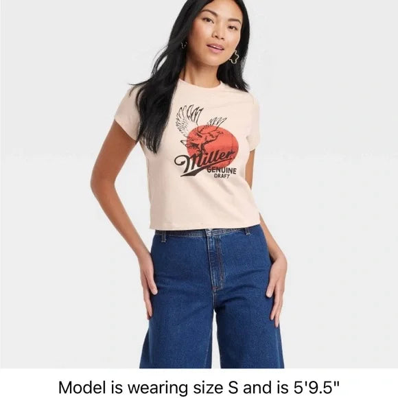 Add this Women's Miller Eagle Short Sleeve Graphic Baby T-Shirt – Beige to your casual wear collection. Featuring Miller eagle graphics, this baby tee is made from soft, lightweight fabric. The casual style of this tee makes it ideal for everyday wear, whether you're lounging at home or out and about.