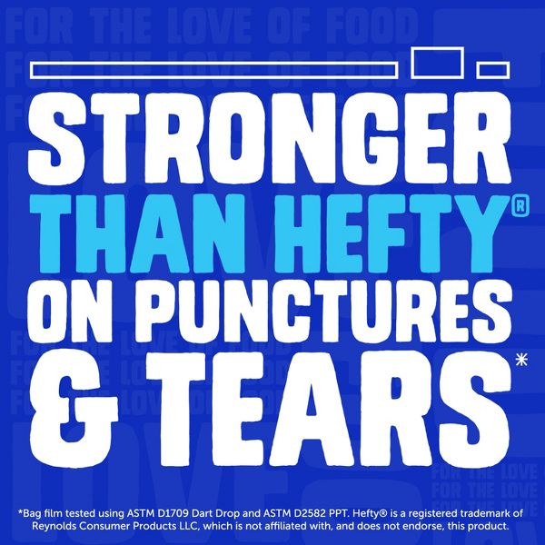 *bag film tested using ASTM D1709 Dart Drop and ASTM D2582 PPT. Hefty® is a registered trademark of Reynolds Consumer Products LLC, which is not affiliated with, and does not endorse, this product.